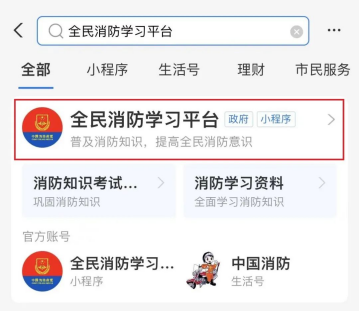 打开支付宝,在搜索栏搜索全民消防学习平台,点击进入。