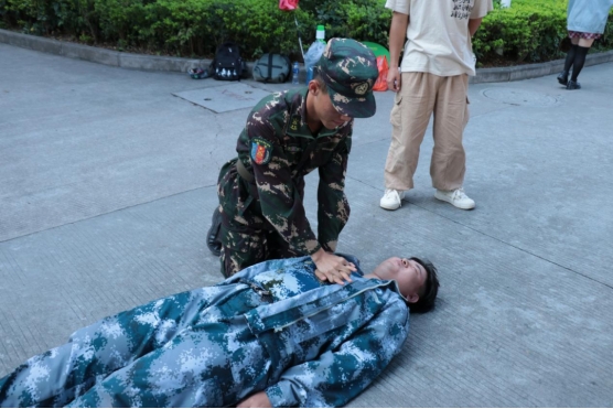 教官向同学们介绍了外伤包扎的具体步骤。用三角巾和绷带为同学们展示了骨折固定、头部受伤等多项伤情包扎技术以及心肺复苏的具体流程,使同学们进一步了解了急救技能。为了让大家进一步掌握急救技术,教官让同学们自行练习包扎,并邀请同学进行心肺复苏的练习。对动作不规范、操作流程不正确等问题进行了纠正,使同学们对于急救技能有了更牢固的掌握。