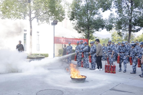 紧急逃生结束后,参训新生前往指定地点进行消防演练。安保处负责老师在现场示范如何正确使用灭火器,给新同学们上了一堂实用的安全技能课。通过老师的生动讲解和规范演示,同学们跃跃欲试,沉着面对熊熊烈火,牢记灭火器“:一提,二拔,三握,四压”的使用口诀,站在上风口对准起火根部进行灭火,成功扑灭火焰。