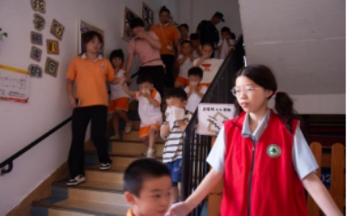 活动伊始,消防队员与院学生会保卫部学生志愿者们共同组织小朋友们进行消防逃生演习。在警报声模拟的“火情”中,志愿者们化身“安全向导”,带领孩子们用湿毛巾捂住口鼻、弯腰低姿,按照预定疏散路线快速有序撤离至操场安全区域。演习过程中,志愿者耐心纠正孩子们的动作细节,帮助他们掌握正确逃生技巧,现场互动氛围热烈。