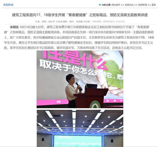 建筑工程系分别于923日及1010日携手德兰光明慈善基金会在江南校区图书馆报告厅开展了“青春爱健康”之抵制毒品、预防艾滋病主题教育讲座,福建省立金山医院妇产科副主任、主任医师辛长征医生用生动有趣的语言和互动方式,面向全系19级、18级、17级学生开设了讲座,达到了禁毒、防艾宣传全覆盖。讲座取得了良好的效果,学生们正确了解了毒品的危害以及性健康安全知识,增强了学生的自我保护意识。
