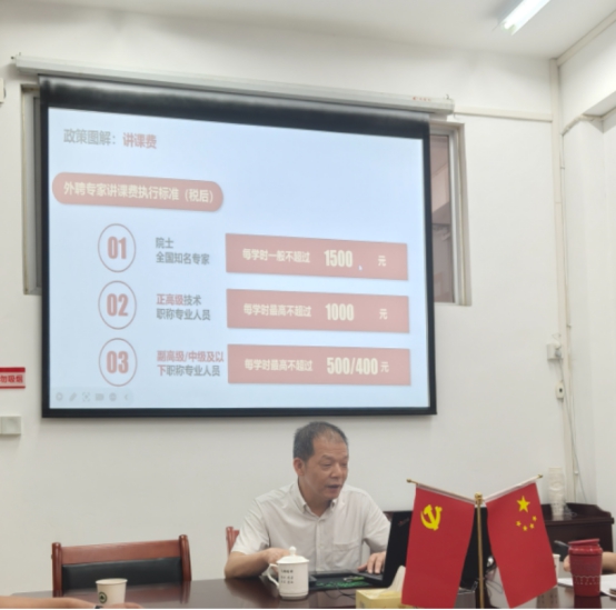 2025年5月21日下午,刘文开院长在第四会议室为计划财务处党支部全体人员上了一堂特别的党课。党课以中央八项规定精神为主题,紧扣《党政机关厉行节约反对浪费条例》各项要求,围绕计财处工作实际,对经费管理、国内差旅、公务接待、会议活动和资源节约等细则进行深刻解读。计划财务处全体工作人员参加学习。