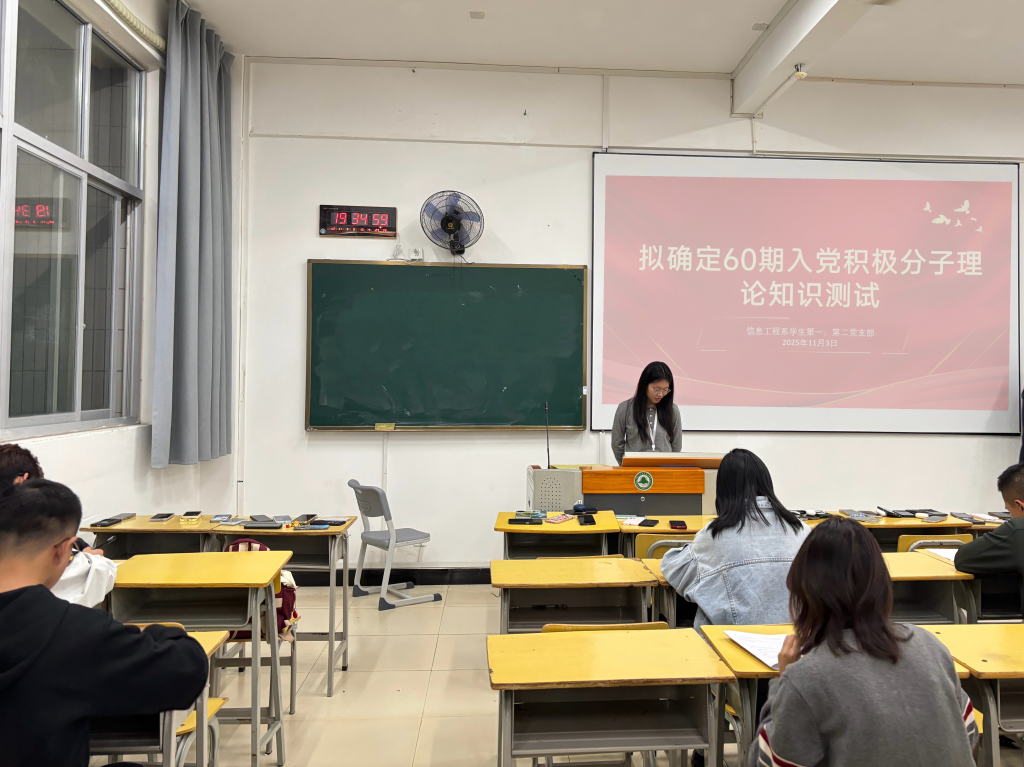 为进一步强化入党积极分子的党的理论素养,严把党员发展“入口关”,11月3日,信息工程系学生党支部组织拟确定的第60期入党积极分子开展党的理论知识测试,以考促学、以学促行,切实夯实入党积极分子的思想根基。