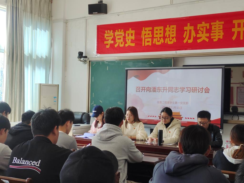 为了汲取榜样力量,掀起向潘东升同志学习的热潮,信息工程系学生第一党支部于2021年11月11日在实训三408会议室,组织开展以向潘东升等同志学习研讨会,本次会议由学生第一党支部书记秦英爱主持,支部师生党员、入党积极分子参会。