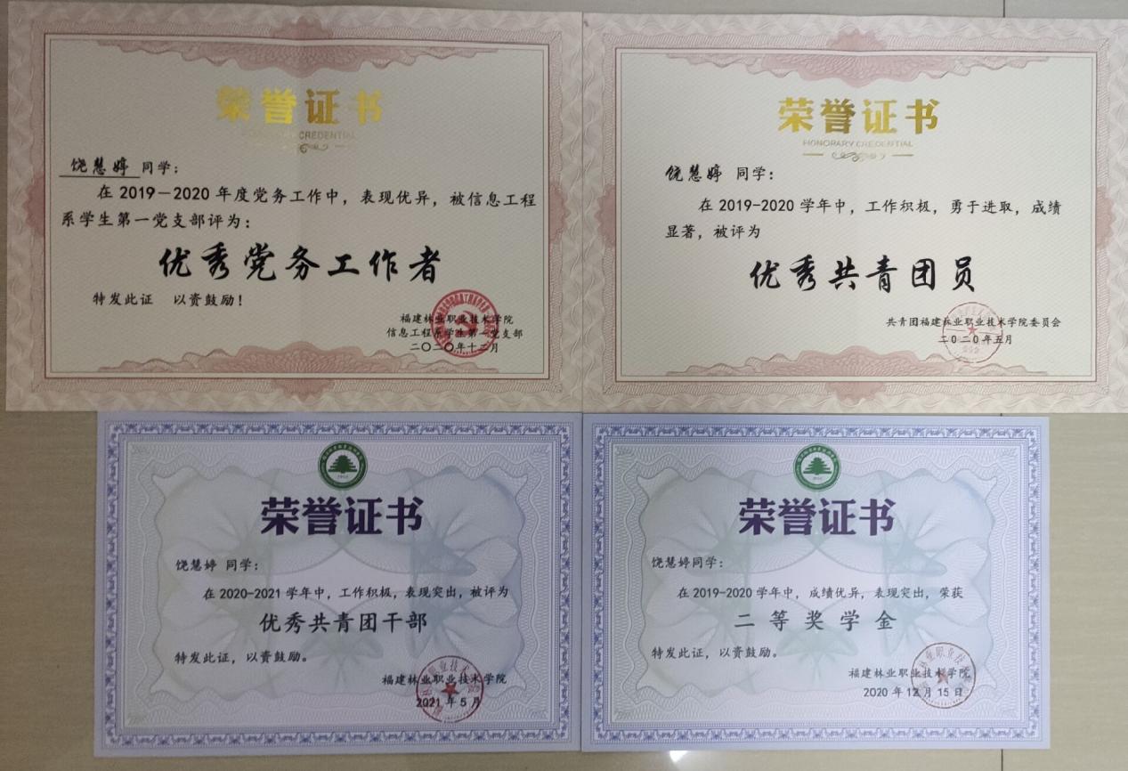 在学习中她敢于探索寻求适合自己的学习方法,并取得了优异成绩,曾获校二等奖学金、“三好学生”等荣誉称号。生活中她积极乐观、诚实守信、乐于助人、孝敬父母、尊敬师长、团结同学,遵守校规校纪,以饱满的热情迎接生活中每一天的挑战,每逢遇到困境中的同学总是设法给予帮助或给以安慰,深得同学们的敬佩。在工作方面,担任班级组织委员、系学生第一党支部党务小组副组长一职。她能积极做好本职工作,帮助辅导员管理班级,起到了非常好的带头作用,积极协调老师和同学间的关系,解决宿舍矛盾,积极参加院系组织的各类活动,起模范带头作用,受到师生一致好评。曾被评为校“优秀团员”、“优秀学生干部”和支部“优秀党务工作者”等。