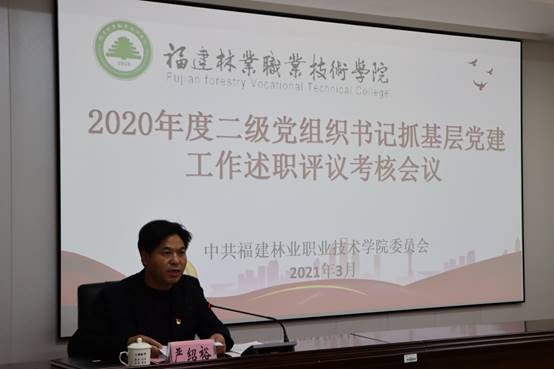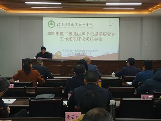 为深入学习贯彻习近平新时代中国特色社会主义思想,把党的政治建设摆在首位,进一步推动全面从严治党向基层延伸,促进基层党建全面进步、全面过硬,3月9日下午,院党委在江南校区办公楼6楼会议室组织召开2020年度二级党组织书记抓基层党建工作述职评议考核会议。学院4个直属党支部及7个系党总支书记进行现场述职,并接受参会人员的民主评议和现场测评。