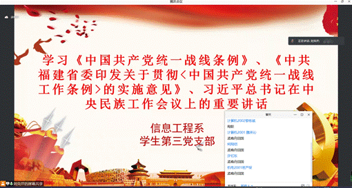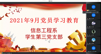 在疫情防控特殊时期,为扎实开展党员学习教育,9月26日晚信息工程系学生第三党支部在腾讯会议平台举行本月支部线上学习交流会议,会议由党支部书记刘克芹老师主持,支部全体师生党员、入党积极分子参会。