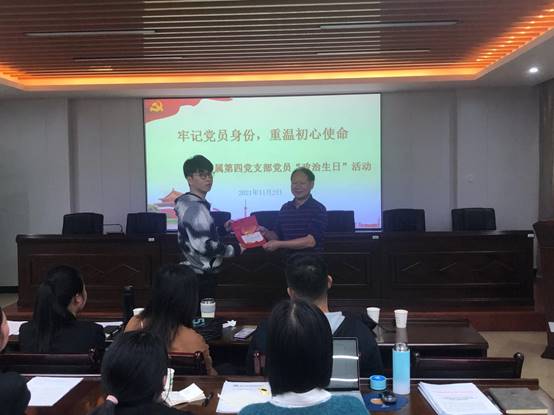 2021年11月2日下午,直属第四党支部在实训二6楼会议室开展党员“政治生日”活动,为本支部10月入党的俞玥、朱友城两位2位党员同志集体过“政治生日”。活动由党支部书记郭先根主持。