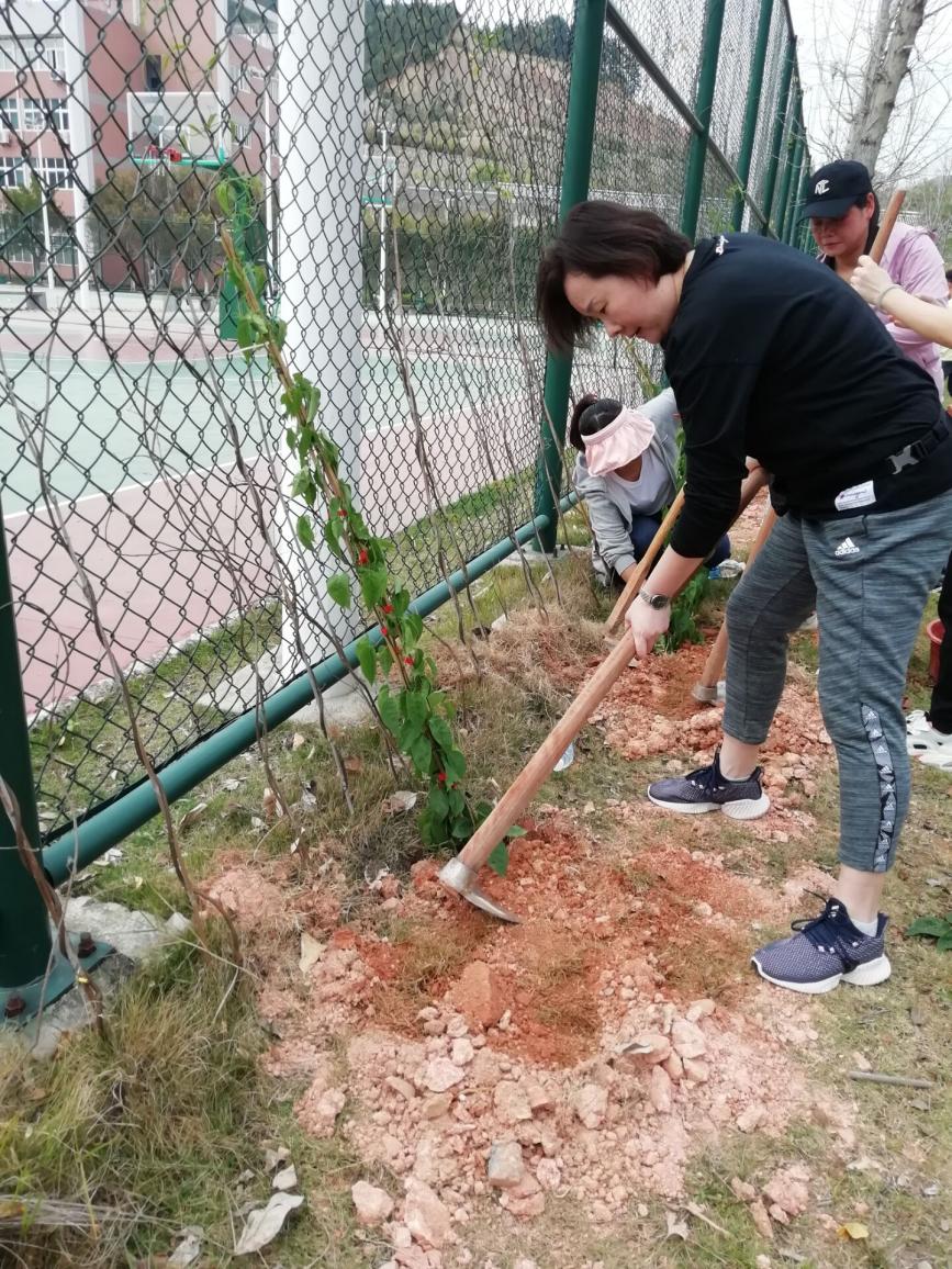 黄尘漫漫中党旗招展,校园绿化带人声鼎沸。党支部全体党员一起挥锹播绿,挖坑、扶苗、埋土、踩实、浇水,一个个干劲十足。大家分工协作、相互配合,种下一棵棵树苗,也种下一个个希望,一片初生的“香樟林”、“油麻藤”迎风招展,焕发盎然生机。疫情终将散去,希望正在萌芽。篮球场围墙周边爬满绿植,待其生根发芽,将带来一片生机勃勃的景象。