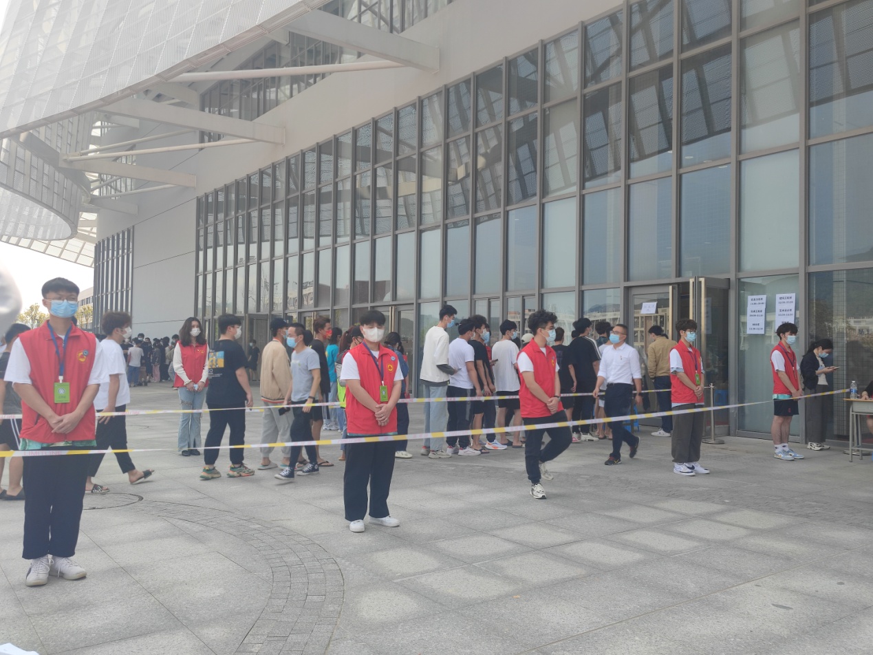 党员先锋队和志愿服务队在组织员罗勇老师的统一指导下,做好现场的秩序维护工作,时刻提醒学生保持一米安全间距,戴好医用口罩,做好个人防护,严格按照规定流程进行扫码预约、扫码认证和核酸检测采样,确保整个核酸检测工作有序、有效进行。