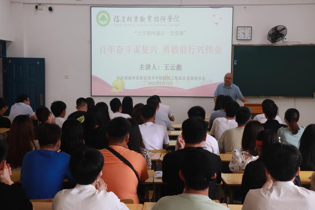 建筑工程系党总支书记王云彪以“百年奋斗谋复兴 勇毅前行兴伟业”主题为全系2022届毕业生党员开展“大学期间最后一堂党课”,寄语毕业生党员要时刻牢记共产党员身份,弘扬“敬业、吃苦、务实、进取”的天麟精神,坚定为人民服务的理想信念和宗旨意识,筑牢党员的初心和使命,在各自工作岗位上,充分发挥一名党员的先锋模范作用,凝聚矢志拼搏的奋斗力量,埋头苦干,勇毅前行,开创未来,努力在奋进青春中书写自己更加辉煌的篇章、更加灿烂的画卷和更加伟大的荣光!