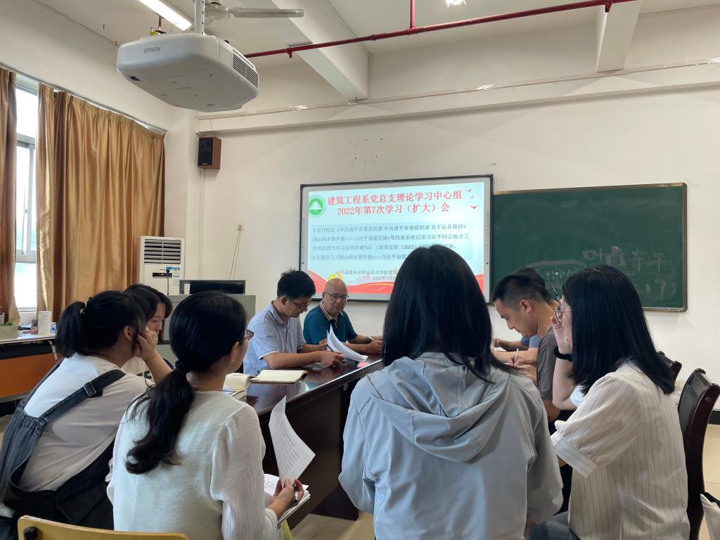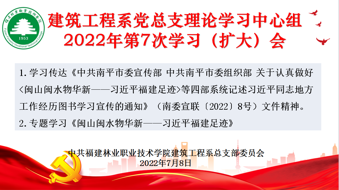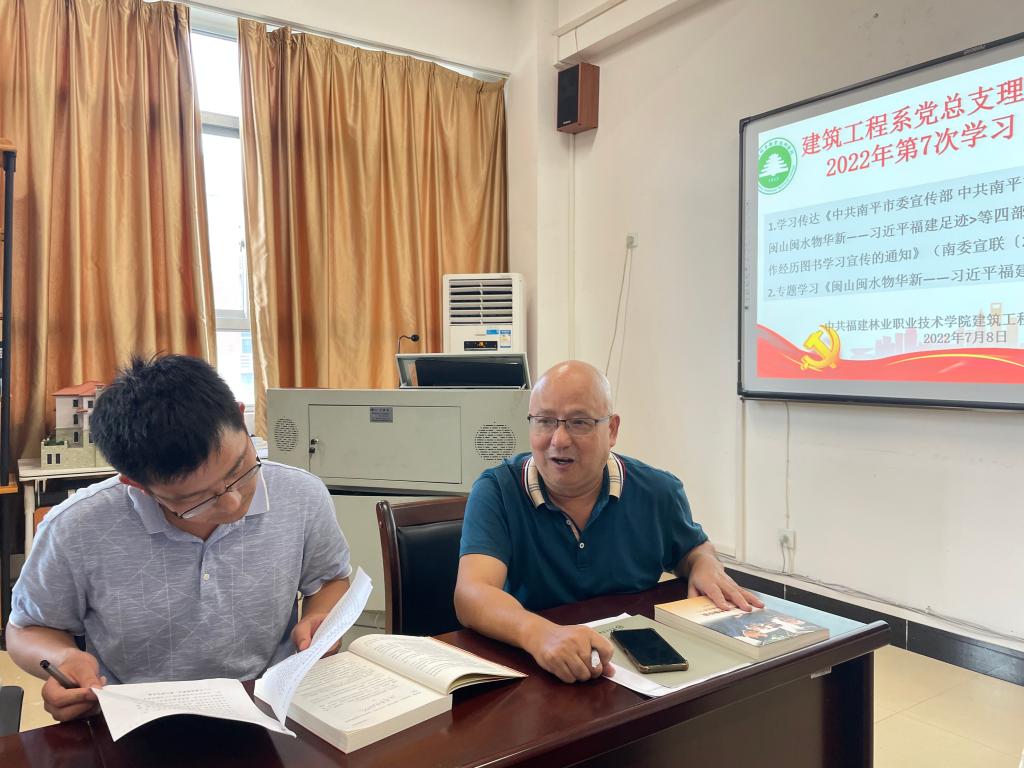 2022年7月8日,建筑工程系党总支理论学习中心组组织召开2022年第7次学习(扩大)会议暨《闽山闽水物华新--习近平福建足迹》学习心得分享会,主要学习传达《中共南平市委宣传部 中共南平市委组织部 关于认真做好<闽山闽水物华新--习近平福建足迹>等四部系统记述习近平同志地方工作经历图书学习宣传的通知》(南委宣联〔2022〕8号)文件精神,并结合前期自学《闽山闽水物华新--习近平福建足迹》书籍内容,联系各自工作实际谈谈学习心得体会。学习中心组全体成员,建筑工程系党总支所属四个党支部负责人、学生科长兼团总支书记刘克芹及青年教师党员代表唐红等同志出席分享会,分享会由建筑工程系党总支书记王云彪主持。