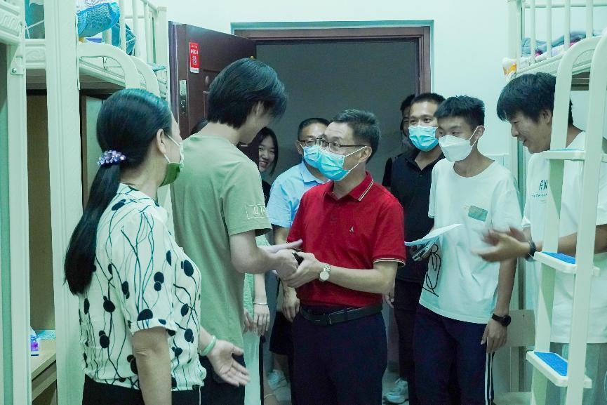 为了解新生入住宿舍情况,为新生送去温暖与关怀,2022年9月12日晚七点,学院党委副书记严绍裕、副院长李肇锋、学工部部长蔡敏、系党总支书记陈政、系主任曾秀云、系党总支副书记叶章球、系副主任张建红、系党总支专职组织员欧阳昭勇、系学生科科长兼团总支书记廖士喜及新生辅导员一行深入走访2022级新生宿舍。走访期间,院系领导及辅导员的关怀与勉励,深深打动了新生,让新生们感受到院系领导和老师对他们殷切的期望和关怀。