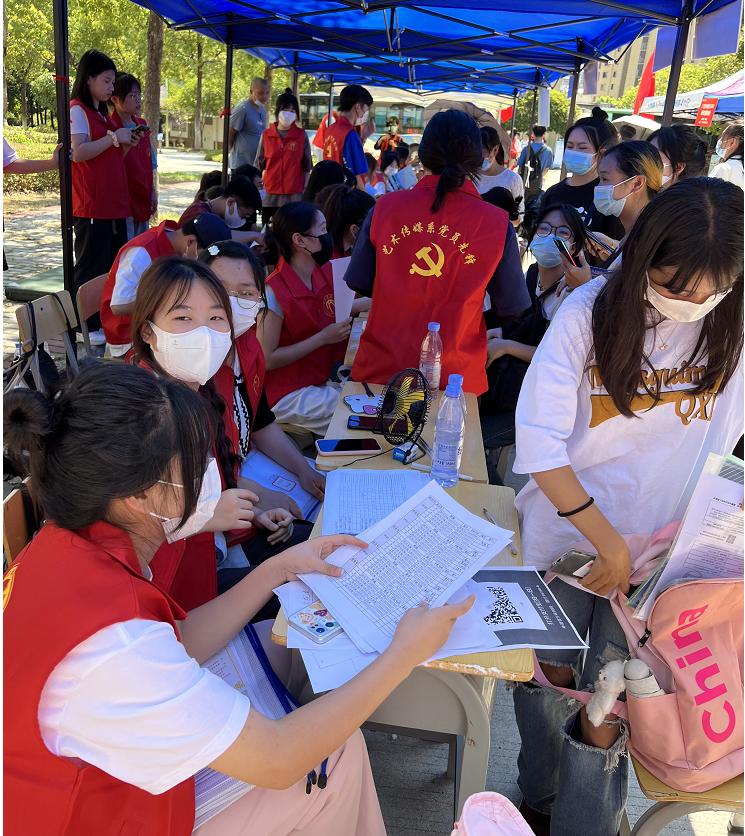 师生志愿者们严格按照学院要求做好新生报到期间的疫情防控工作要求,在新生通道处细心检测体温、核验48小时核酸检测阴性证明、个人行程轨迹等。