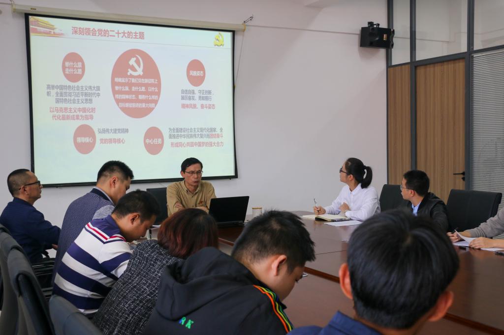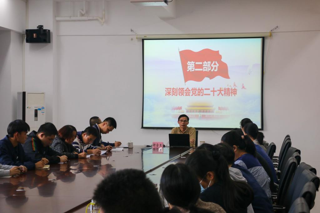 谢副院长从“深刻领会党的二十大主题”和“深刻领会党的二十大精神”等两个方面展开,带领大家深刻领会了党的二十大的主题明确宣示了我们党在新征程上举什么旗、走什么路、以什么样的精神状态、朝着什么样的目标继续前进的重大问题,明确党的领导核心和中心任务。并且从理论发展角度生动诠释了马克思主义中国化时代化。同时,带领大家深刻领会了“过去5年的工作和新时代10年的伟大变革”、“开辟马克思主义中国化时代化新境界”、“新时代新征程中国共产党的使命任务”、“中国式现代化的中国特色和本质要求”、“五位一体”总体布局的重大部署”“教育科技人才、法治建设、国家安全等方面的重大部署”、“国防和军队建设、港澳台工作、外交工作等方面的重大部署”、“坚持党的全面领导和全面从严治党的重大部署”等八个方面的重要内容和重大意义。