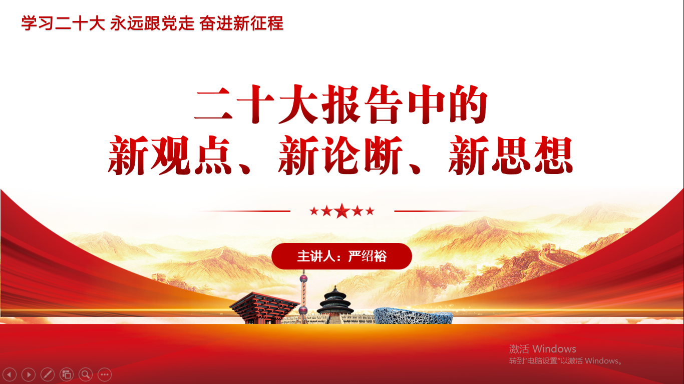 严副书记表示,20221016日上午,中国共产党第二十次全国代表大会在人民大会堂开幕。习近平总书记代表第十九届中央委员会向大会作了题为《高举中国特色社会主义伟大旗帜 为全面建设社会主义现代化国家而团结奋斗》的报告, 党的二十大报告中提出了一系列新观点、新论断、新思想、新战略、新要求,我们非常有必要进行梳理和学习贯彻。
