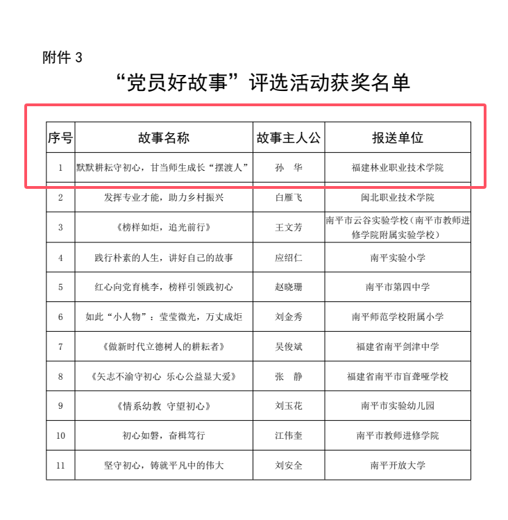 近日,中共南平市委教育工委印发《关于公布“书记好党课”、“支部好案例”、“党员好故事”评选活动获奖名单的通知》(南委教办〔2024〕7号),经市直属学校党组织推荐、市委教育工委组织专家组进行观摩评选、公示等程序,我院报送的作品全部获奖,其中“书记好党课”一等奖1个,二等奖1个,三等奖1个;“支部好案例”3个;“党员好故事”1个。