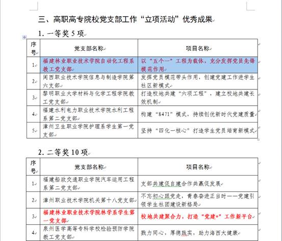 近日,中共福建省委教育工委公布2020年福建省高校党支部工作“立项活动”优秀成果和“党员好故事、书记好党课、支部好案例”获奖名单,我院申报项目《以“五个一”工程为载体,充分发挥党员先锋模范作用》(信息工程系教工党支部)、《校地共建聚合力,打造“党建+”工作新平台》(林学系学生第一党支部)、《党员“1+X”责任寝室联系制度建立与实践》(园林系学生支部)分别荣获高职高专院校党支部工作“立项活动”优秀成果一等奖、二等奖、三等奖,艺术传媒系学生党支部案例《诗意的国旗下讲话》入选高职高专院校“党员好故事、书记好党课、支部好案例”的“支部好案例”。其中,《以“五个一”工程为载体,充分发挥党员先锋模范作用》立项项目位列一等奖第一名。