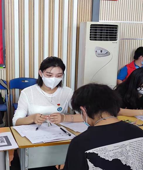 艺术传媒系党员先锋岗学生党员和入党积极分子积极融入迎新工作当中,在校门口和迎新报到点引导新生有序排队,测量体温,查验健康码、行程码和新冠疫苗接种记录等。