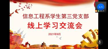在疫情防控特殊时期,为扎实开展党员学习教育,926日晚信息工程系学生第三党支部在腾讯会议平台举行本月支部线上学习交流会议,会议由党支部书记刘克芹老师主持,支部全体师生党员、入党积极分子参会。