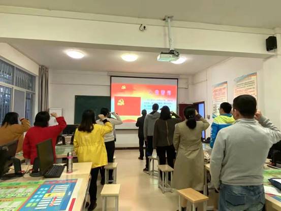 经济管理系党总支书记谢福荣带领全体党员面对党旗重温一次入党誓词,进一步坚定理想信念,强化讲党性、重品行、作表率意识。