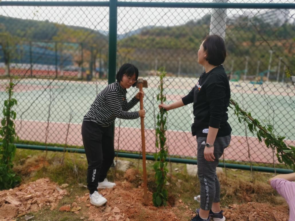 黄尘漫漫中党旗招展,校园绿化带人声鼎沸。党支部全体党员一起挥锹播绿,挖坑、扶苗、埋土、踩实、浇水,一个个干劲十足。大家分工协作、相互配合,种下一棵棵树苗,也种下一个个希望,一片初生的“香樟林”、“油麻藤”迎风招展,焕发盎然生机。疫情终将散去,希望正在萌芽。篮球场围墙周边爬满绿植,待其生根发芽,将带来一片生机勃勃的景象。
