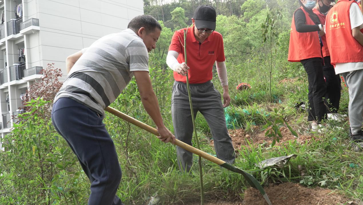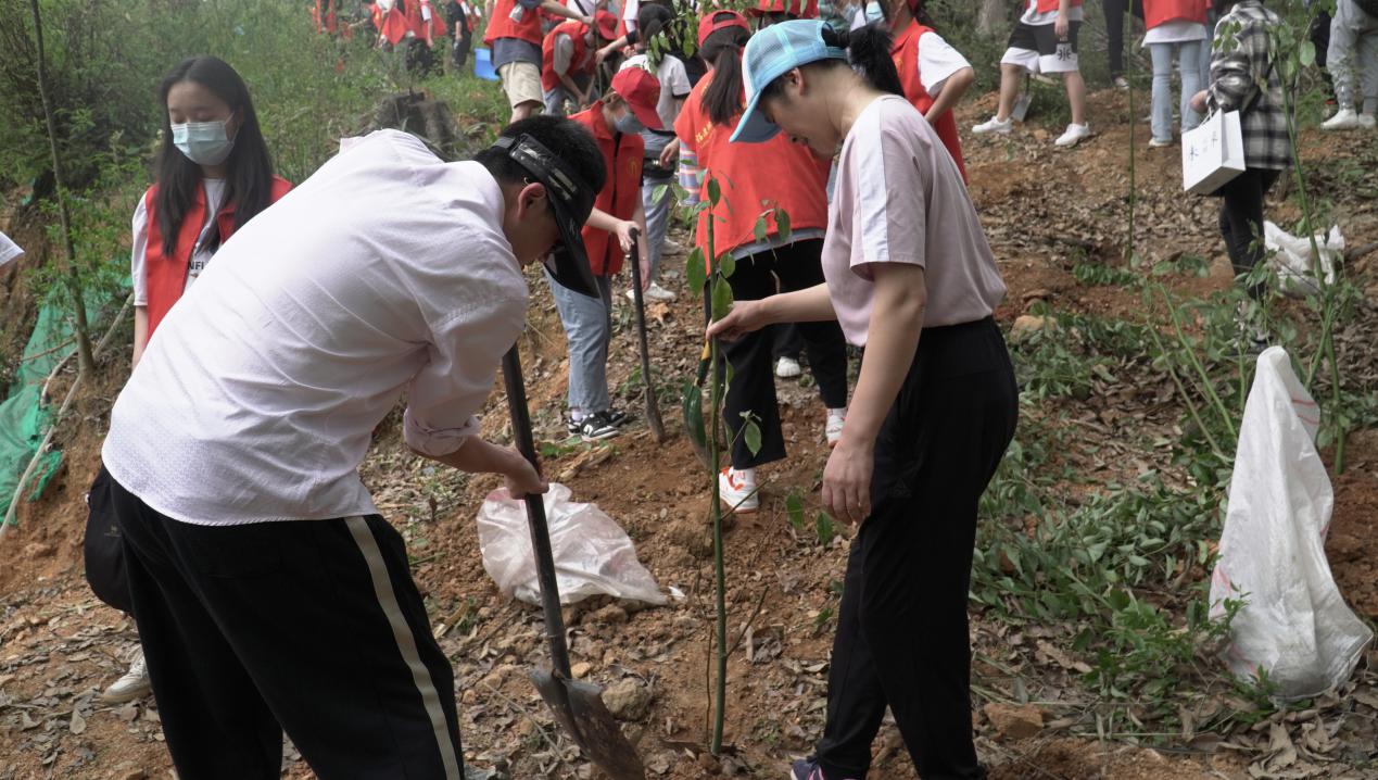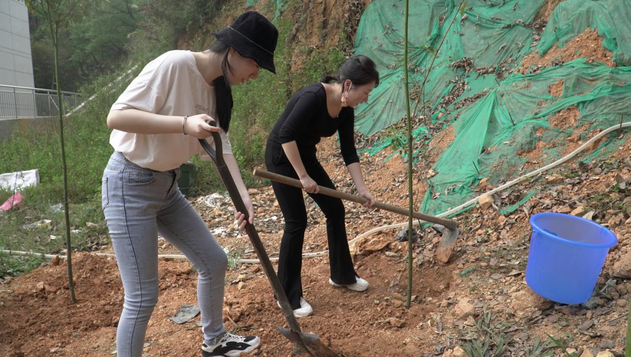老师和同学们抡起锄头,挥舞着铁锹,每道工序、每个环节都一丝不苟,确保植一棵、活一棵,为天麟山增添一抹生机和活力。