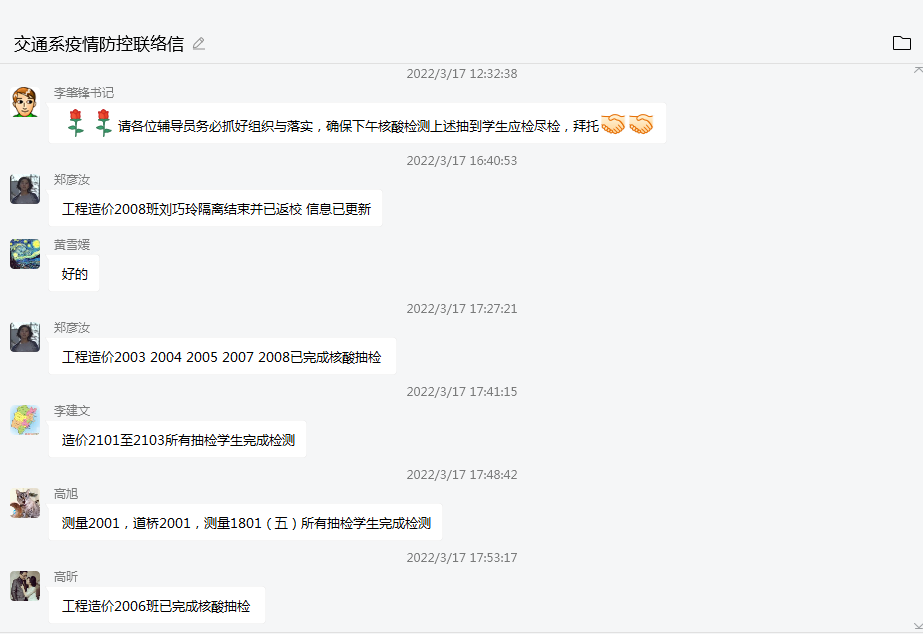 二是积极组织全系师生进行核酸检测。按照学院相关部署,318日,我系抽取25%的师生参加核酸检测,320日,组织318日没有参加核酸检测的师生进行全员核酸检测。我系高度重视全系师生的核酸检测工作,党总支指派专人分别负责教师和学生的检测工作,安排学工组辅导员全员到场,组织本班级同学按顺序进行核酸检测,安排学生党支部的志愿者在核酸检测现场进行引导工作,维持现场秩序,充分发挥党员的先锋模范作用。
