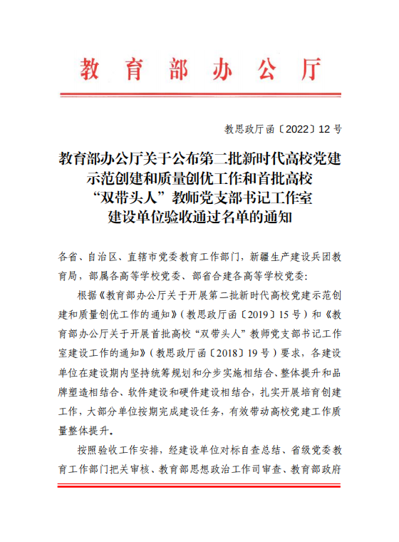 2022年6月7日,教育部办公厅发布《教育部办公厅关于公布第二批新时代高校党建示范创建和质量创优工作和首批高校“双带头人”教师党支部书记工作室建设单位验收通过名单的通知》(教思政厅函〔2022〕12号),我院信息工程系党总支作为第二批“全国党建工作标杆院系”建设单位顺利通过验收。