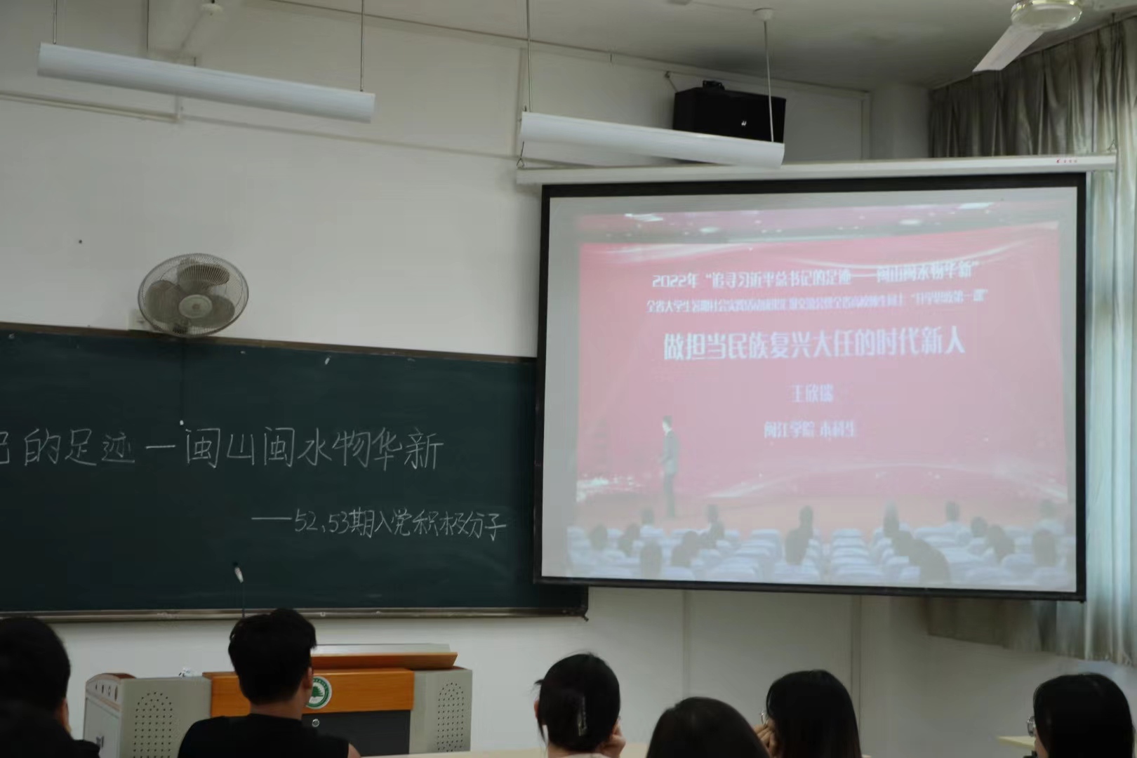 在场师生认真收看了“追寻习近平总书记的足迹-闽山闽水物华新”全省大学生暑期社会实践活动成果视频,聆听了厦门大学罗仁杰同学、福建师范大学谷春蕊同学与闽江学院王欣瑞同学的实践心得分享,学习了中国社会科学院马克思主义研究院辛向阳书记、中国人民大学马克思主义学院陶文昭副院长的点评指导。