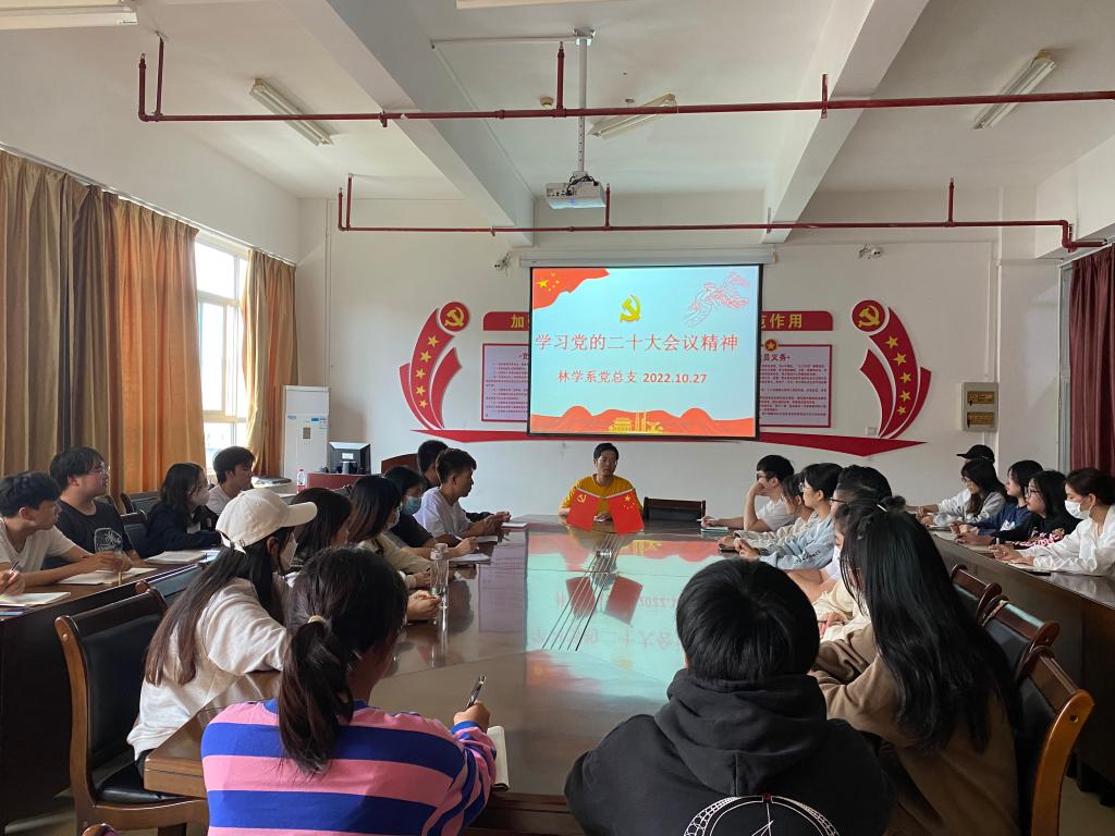 为了进一步学习贯彻党的二十大精神,林学系党总支组织学生党员于10月27日在会议室组织开展党的二十大精神专题学习活动,活动由专职组织员罗勇老师主持,两个学生党支部代表成员出席学习活动。