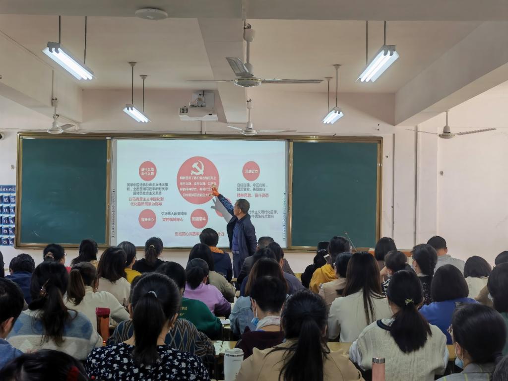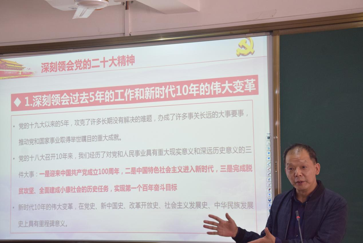 接着,刘文开院长带领大家深刻领会了“过去5年的工作和新时代10年的伟大变革”、“开辟马克思主义中国化时代化新境界”、“新时代新征程中国共产党的使命任务”、“中国式现代化中国特色和本质要求”、“‘五位一体’总体布局的重大部署”、“教育科技人才、法制建设、国家安全等方面的重大部署”、“国防和军队建设、港澳台工作、外交工作等方面的重大部署”、“坚持党的全面领导和全面从严治党的重大部署”等八个方面的重要内容和重大意义,并提出祖国的未来与希望寄托于青年肩上,希望同学们用党的奋斗历程和伟大成就鼓舞斗志、指引方向,做时代的有为青年,砥砺前行。
