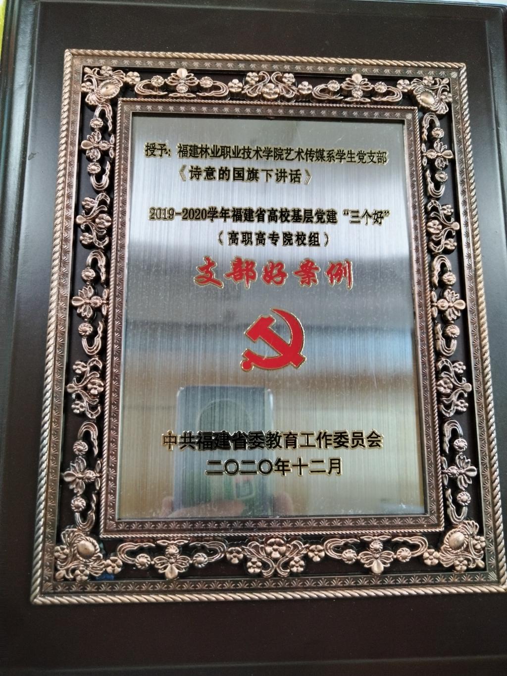 近两年来,艺术传媒系学生党支部党建工作成效初步显现,党建品牌初步确立,有力助推了各项工作的开展。艺术传媒系学生第一党支部被确定为学院“先进基层党组织”和学院“党建工作样板支部”。艺术传媒系学生党支部《诗意的国旗下讲话》被评为2019-2020学年福建省高校基层党建“三个好”(高职高专院校组)“支部好案例”。学生第二党支部立项活动《举办“小太阳”少儿公益兴趣班,促进学生德智体美劳全面发展》获得福建省高校党支部工作“立项活动”优秀成果三等奖。