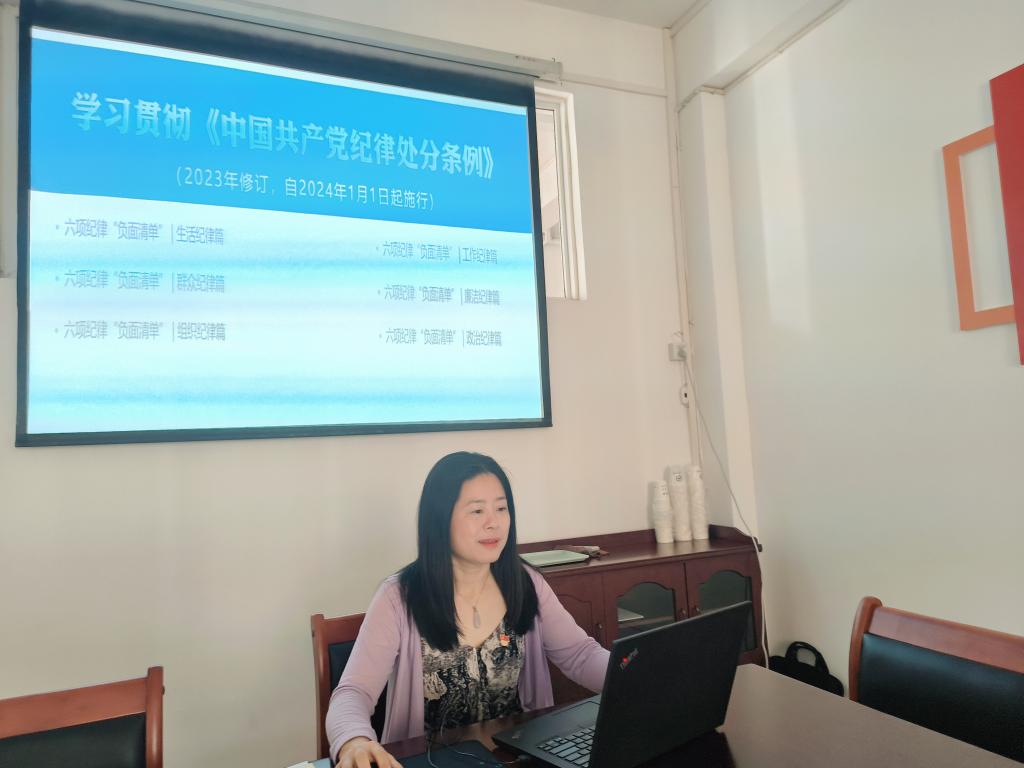 李霞书记首先为支部党员讲授党纪学习教育专题党课,集中学习新修订的《中国共产党纪律处分条例》(以下简称《条例》)。课程从《条例》修订的背景、重要意义和主旨要义开始介绍。接着从政治纪律、组织纪律、廉洁纪律、群众纪律、工作纪律、生活纪律等方面结合实际案例介绍了《条例》的六项纪律“负面清单”,同时详细讲解了党纪处分的类型。