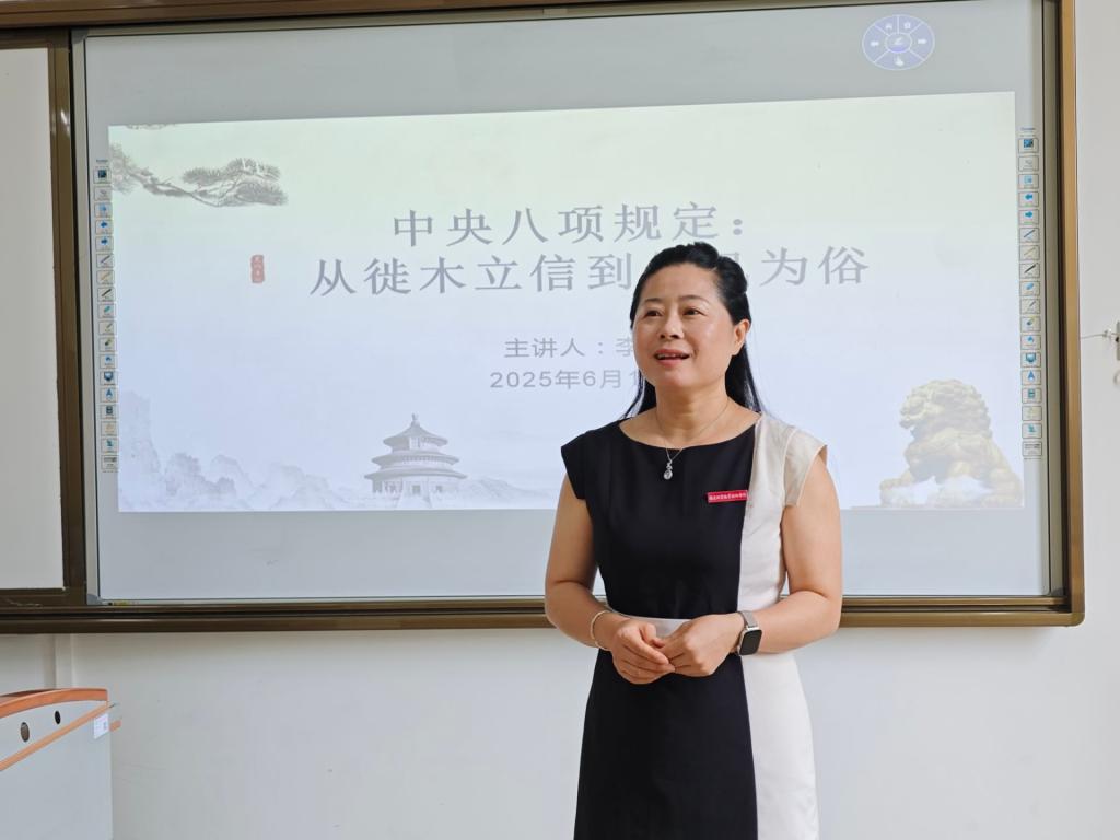 为深入贯彻中央八项规定精神学习教育走深走实,持续强化党员干部及青年学生的纪律、规矩与廉洁意识。2025年6月19日上午,院党委委员、组织部(统战部)部长李霞以“中央八项规定——从徙木立信到化风为俗”为主题,为组织部(统战部)党支部全体党员和林学系旅游管理2401班全体学生讲授专题党课。党课由林学系学生第一党支部书记叶知勇主持。