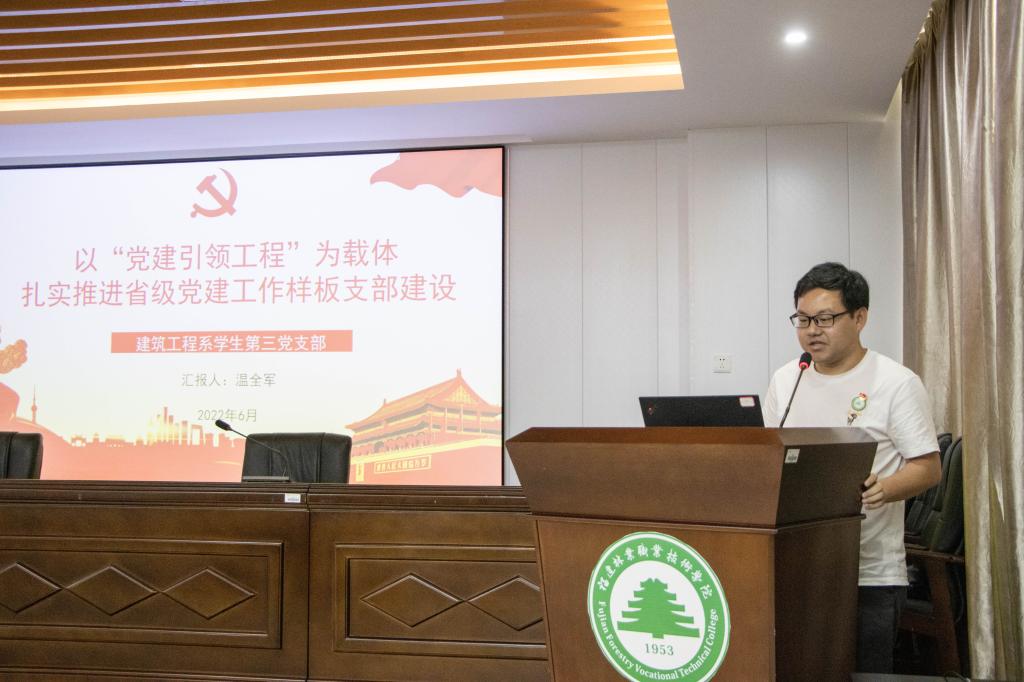 建筑工程系学生第三党支部书记温全军从党建引领思想教育、团建活动、学科建设、志愿服务、社会实践等方面,汇报了建筑工程系学生第三党支部的建设情况。建筑工程系学生第三党支部以“党建引领工程”为载体,深入落实为党育人、为国育才使命,2021年建筑工程系学生第三党支部获得南平市教育系统先进基层党支部。