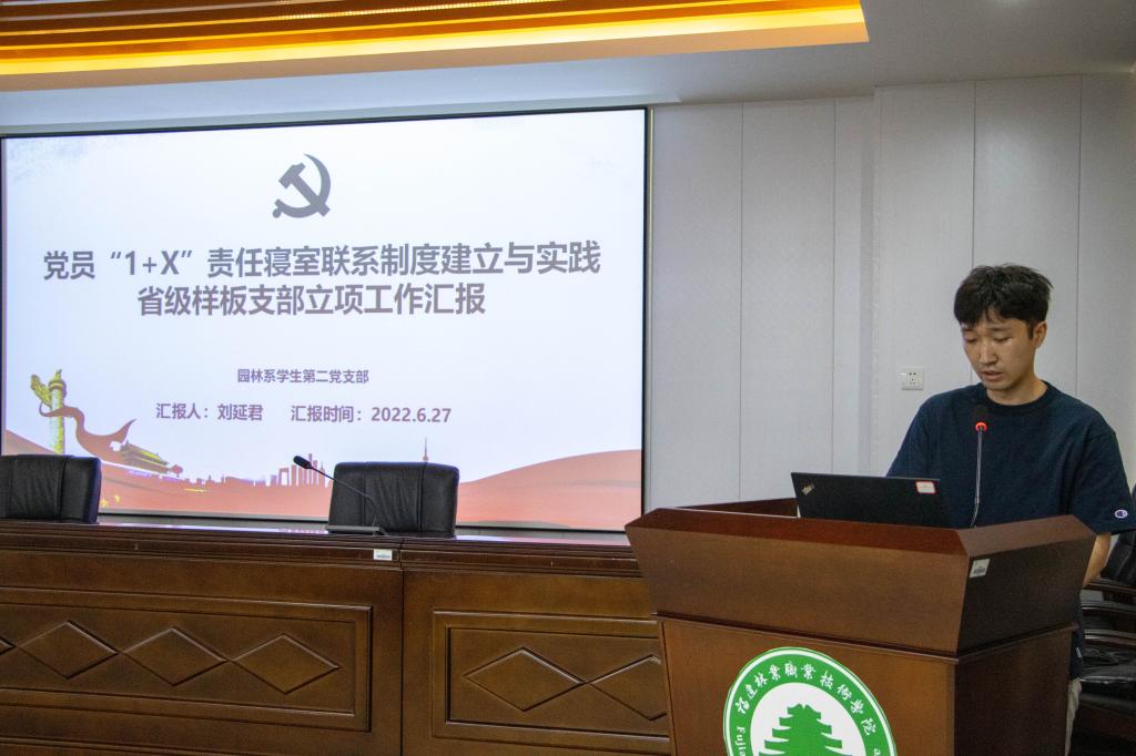 园林系学生第二党支部书记刘延君介绍了“党员’1+X’责任寝室联系制度建立与实践”项目背景,通过党员联系宿舍、选优配好党员队伍、制定积极分子考核管理办法、谈心谈话等举措推进支部建设,下一步园林系学生第二党支部将联合社区共建,拓展育人阵地,进一步加强建设成效。