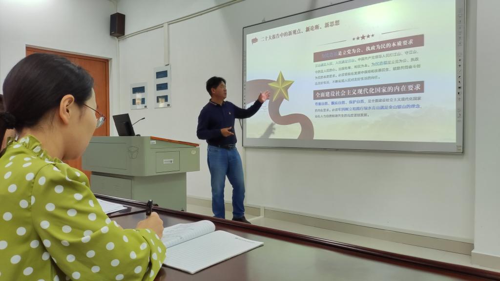 党课上,严副书记主要围绕“大会主题”“三个务必”“十年来三件大事”“党的中心任务”“中国式现代化”“五个必由之路”等具体内容展开论述,简要梳理了二十大报告中的新观点、新论断、新思想。他表示,党的二十大是在全党全国各族人民迈上全面建设社会主义现代化国家新征程、向第二个百年奋斗目标进军关键时刻召开的一次十分重要的大会。他指出,党的二十大全面总结了过去5年工作和新时代10年的伟大变革,系统阐述了新时代坚持和发展中国特色社会主义的重大理论和实践问题,科学谋划了未来一个时期党和国家事业发展的目标任务和大政方针,是团结动员全党全国各族人民全面建设社会主义现代化国家、全面推进中华民族伟大复兴的政治宣言和行动纲领。他强调,我们应该积极响应党的号召,高举中国特色社会主义伟大旗帜,全面贯彻新时代中国特色社会主义思想,弘扬伟大建党精神,自信自强、守正创新,踔厉奋发、勇毅前行,为全面建设社会主义现代化国家、全面推进中华民族伟大复兴而团结奋斗。