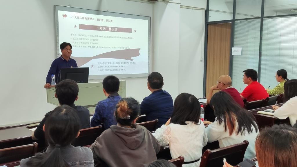 此次辅导党课主题鲜明、内容丰富、图文并茂、宣讲深入,使大家进一步理解了党的二十大报告中的新观点、新论断、新思想深刻内涵,使大家进一步明白了学习和贯彻党的二十大精神的必要性和紧迫感,并提出了三点学习宣传贯彻意见,一是党总支和党支部要把学习宣传贯彻党的二十大精神摆上重要议事日程,精心组织安排。利用“三会一课”、主题党日活动、专题讲座、专题研讨、知识竞赛等多样化有特色的系列活动,推动基层党组织学习宣传贯彻党的二十大精神走在前列,迅速兴起学习宣传贯彻党的二十大精神的热潮;二是教师和党员要把学习宣传贯彻党的二十大精神作为当前及今后一个时期的首要政治任务。做到先学一步、深学一层、多悟一分,深入理解内涵,精准把握外源,从党的二十大精神中找准方向、找到途径,进而汇聚精神的力量、信念的力量,自觉用党的二十大精神武装头脑、指导实践、推动工作,真正落实立德树人根本任务,做新时代“四有”好老师;三是青年学生要持续深入学习习近平新时代中国特色社会主义思想和党的二十大精神。坚定不移听党话、跟党走,怀抱梦想又脚踏实地,勤奋学习,刻苦实践,磨炼意志,增长本领,自信自立,珍惜韶华,在追逐梦想的新征程上勇毅前行,努力成为有理想、敢担当、能吃苦、肯奋斗的新时代好青年。