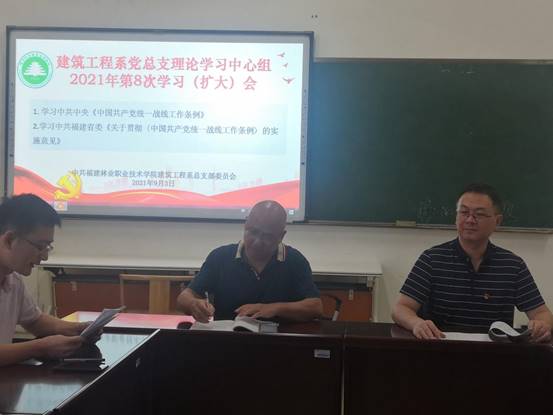 本网讯 9月3日,建筑工程系党总支理论中心组召开2021年第8次学习(扩大)会议,专题学习《中国共产党统一战线工作条例》及《中共福建省委关于贯彻<中国共产党统一战线工作条例>的实施意见》。建筑工程系党总支书记王云彪、副书记兼主任彭忠伟,其他党总支委员叶新颖、陆晓莉、温全军,学生党支部书记林燕琼、吴文杰及党内优秀青年教师代表陈慧婷、党外优秀青年教师代表张李平等9位同志出席学习会议,会议由系党总支书记王云彪主持,专职组织员叶新颖同志领学。