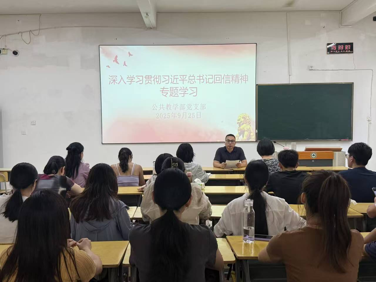 为认真学习领会习近平总书记重要回信精神,2025年9月25日下午,公共教学部党支部书记徐洪在教学楼210开展“深入学习贯彻习近平总书记重要回信精神”专题学习,要求所有党员要按照习近平总书记指引的方向坚定不移的走下去,要坚持深耕“三农”,发挥好公共教学部特色优势,扎实推进教学发展,更好的发挥基础学科的作用,将理论与实践相结合,为推动建设农业强国作出更大贡献。公共教学部党支部全体教师党员到场聆听并引发热议。