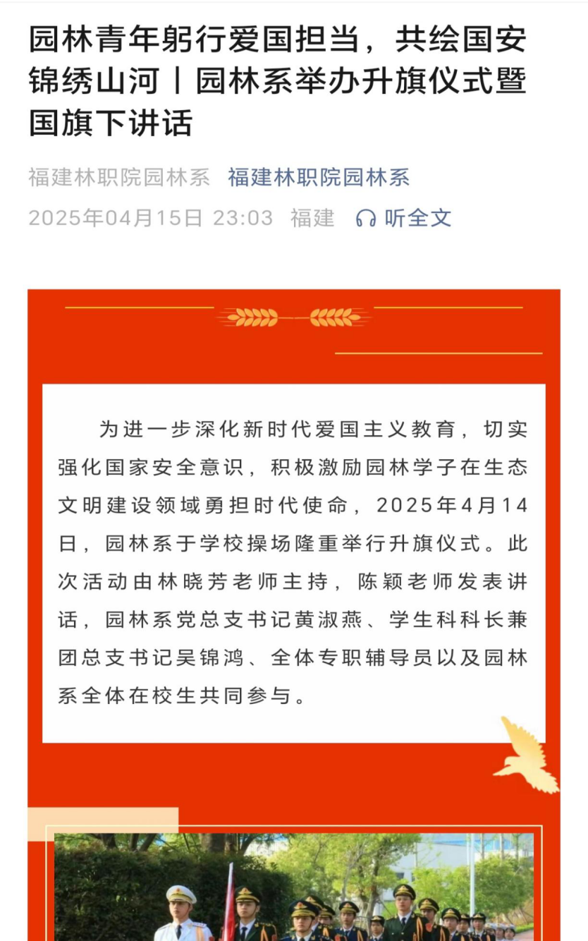 ▲江南校区园林系系举行国家安全教育主题升旗仪式