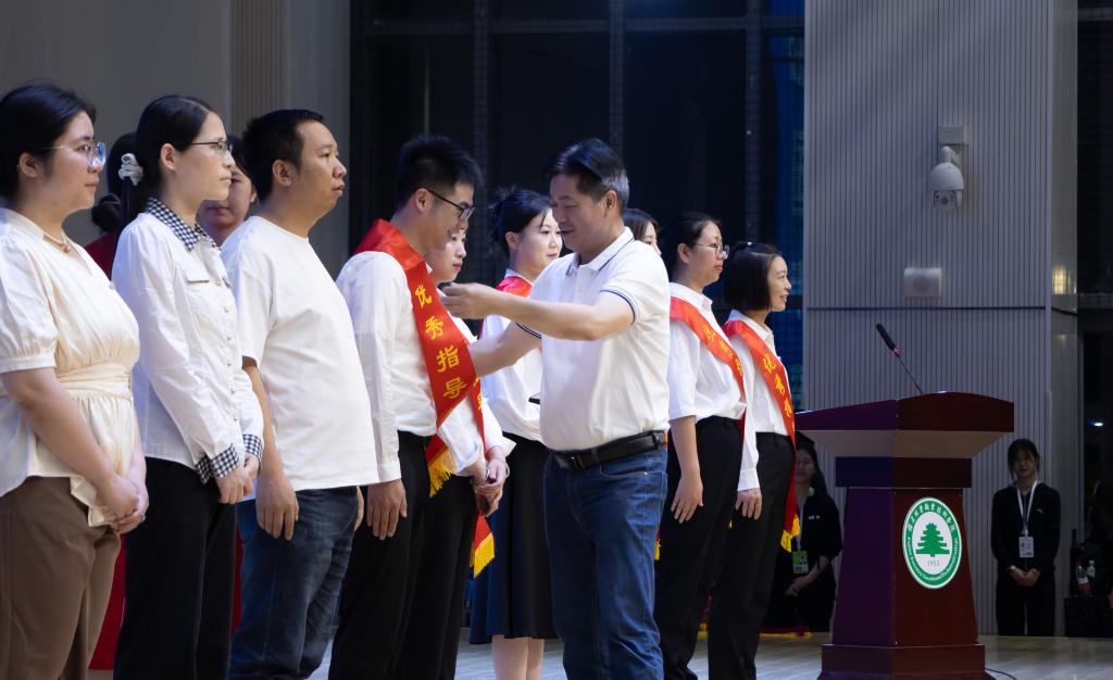院党委副书记严绍裕为获得2025年福建省技能大赛一等奖及以上优秀指导教师绶带。