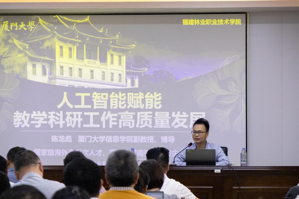 本网讯 为深入学习习近平总书记在中共中央政治局第二十次集体学习时的重要讲话精神,深化人工智能技术在职业教育领域的创新应用,全面提升教师队伍的智能教育素养,推动学院教育教学模式创新与治理能力升级,5月27日下午,院党委书记陈建辉在江南校区行政楼五楼会议室主持召开2025年第5次党委理论学习中心组学习会,邀请国家级海外高层次人才、厦门市“双百计划”领军人才、厦门大学信息学院副教授、博士生导师陈龙彪作专题辅导。党委理论学习中心组成员、各系各部门党政负责人、宣传员、马克思主义学院专职教师参加学习。