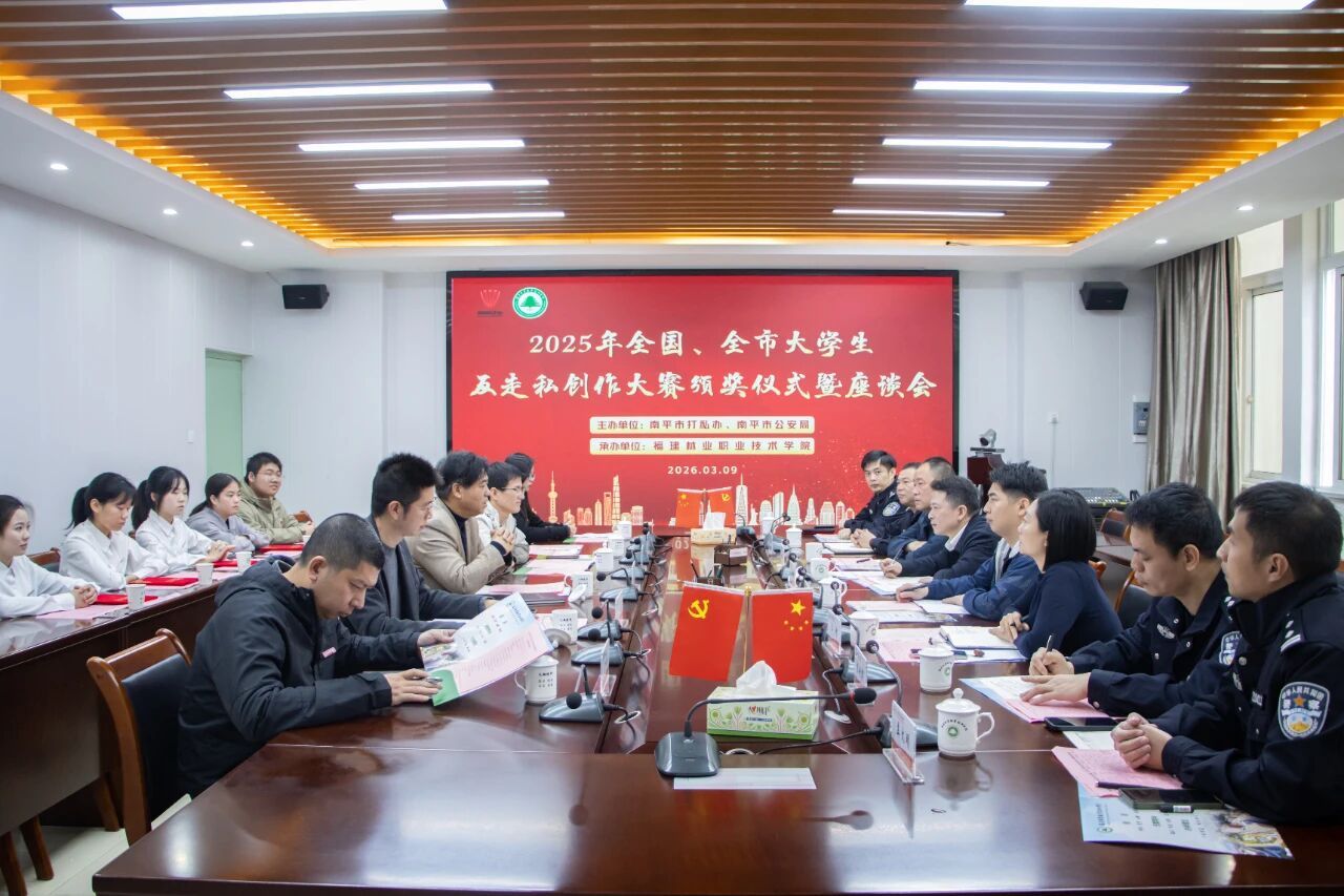 本网讯 为深入贯彻落实习近平法治思想和习近平文化思想,筑牢全民反走私法治防线,3月9日,由南平市打私办、南平市公安局、福建林业职业技术学院联合主办的2025年全国、全市大学生反走私创作大赛颁奖仪式暨教育座谈会在我院举行。福建省公安厅海岸总队副总队长朱国雄、二支队政委刘达文,南平市公安局经侦支队政委陈军华,厦门海关缉私局办公室指挥中心主任王峥,延平分局党委委员、副局长林强等省市相关单位领导出席会议。学院党委副书记严绍裕,学生工作部部长陈友益等相关负责人及获奖师生代表参会,会议由院团委书记吴旻主持。