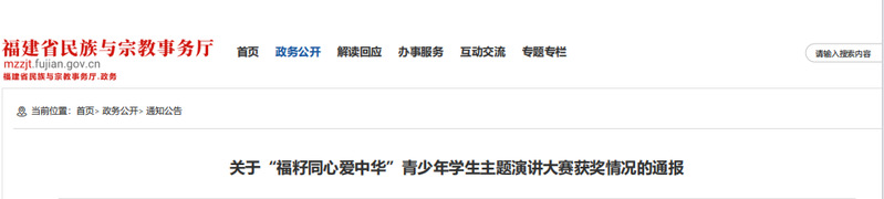 本网讯 近日,由中共福建省委宣传部、中共福建省委统战部、福建省教育厅、福建省民族与宗教事务厅、共青团福建省委联合举办的“福籽同心爱中华”青少年学生主题演讲大赛圆满落下帷幕,共评选出高校组一等奖3个、二等奖6个、三等奖12个、优秀奖19个。我院艺术传媒系新闻采编与制作2301班陈佳颖同学演讲作品《且以青春赴山海,斯贤无惧万重山》、商务英语2402班赵梦瑶同学演讲作品《海峡两岸的亲情守望人》均荣获高校组三等奖。