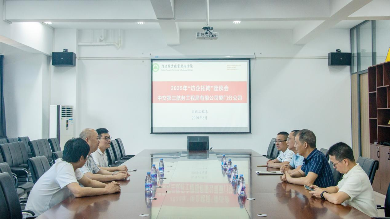 本网讯 6月12日下午,学院交通工程系邀请中交第三航务工程局有限公司厦门分公司入校举办“访企拓岗”促就业座谈会。我院院长刘文开、交通工程系党政领导班子以及企业负责人出席了此次会议。