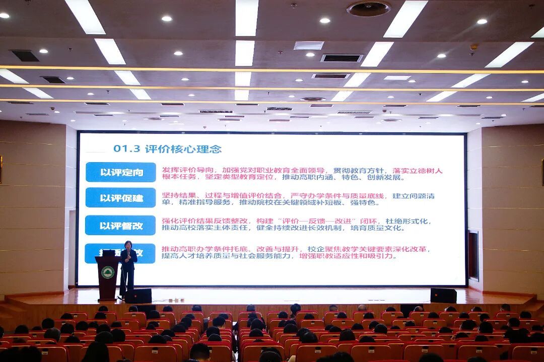 专题培训环节,黄云玲教授作《对标迎评促建 提升办学能力——高职办学能力评价文件解读》专项培训。她系统梳理国家职业教育评价发展脉络,深入解读本轮办学能力评价的新导向、新特点与新标准,重点围绕教学工作评估关键要素的六个一级指标,对评价体系进行全面、细致解读,逐条明晰各观测点标准、佐证材料归集规范及评估访谈工作要点,明确要求各部门、各院系提高站位、严格对标,精准落实各项评价任务,确保迎评工作有序推进。