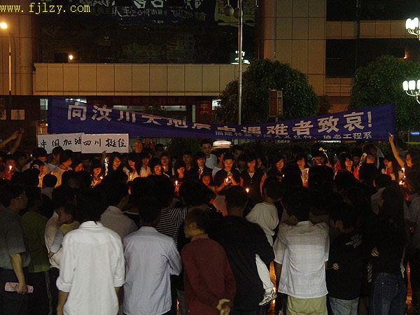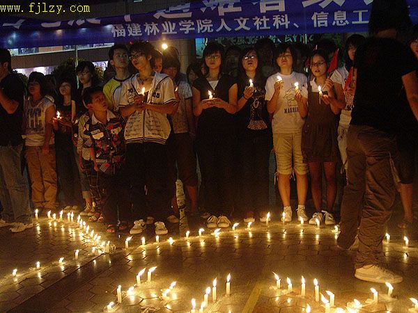 本网讯 5月20日晚,人文社科系(信息工程系)的100名学生在邹小燕老师的带领下,到南平文化广场举行为灾区祈福活动。同学们用蜡烛摆出两个心图案,两个心中间则摆出了汶川与南平的字样。活动开始中时,大家一起演唱了庄严的国歌和歌曲《让世界充满爱》。歌曲过后全场默哀三分钟。举行了以《孩子,抓紧妈妈的手》为主题的诗歌朗诵,并高喊“汶川挺住,中国加油”的口号,活动最后在闽江放流了载着蜡烛的纸船。