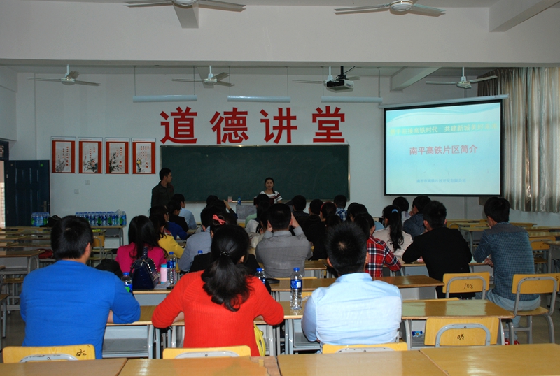 5月6日下午3时,青年教工代表齐聚江南校区实训四310,听取了南平高铁站前指挥中心杨技术员的介绍。杨技术员通过PPT展示,从合福高铁、延平新城、北站片区、南新时代和西站片区五个方面向青年教工们介绍了南平高铁片区未来发展规划状况,让青年教工们了解了构建一大枢纽、二大平台、三大基地和四大中心的延平新城规划蓝图。